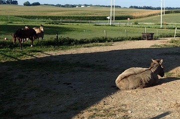 Here I am, on my feet and enjoying breakfast hay with the gang: