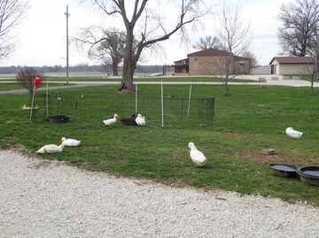 The duck pen was moved over fresh green grass: