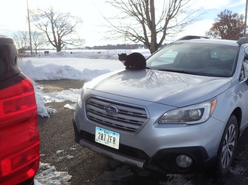 It was only 11℉ this morning, so Schroeder knows a warm car hood is the place to be: