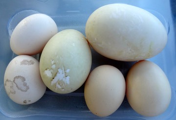 The two largest eggs are duck eggs, but you’ll notice one has about twice the volume as the other, because. .