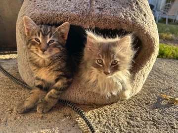 Marbles and Gray-baby say, “Good morning! Tux is still asleep, or else he would be greeting you, too!”