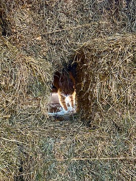 The cat-cops feed damaged eggs to the hens. I wonder if that’s why the hen (whoever she was) pecked it in the first place? Chickens think eggs are delicious, too! 🐴