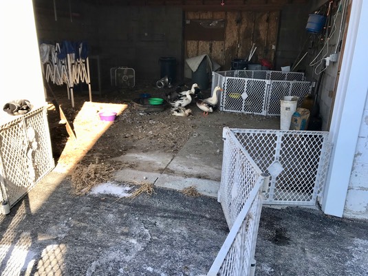 So the cat-cops moved Danny and the other ducks from under the hay barn to the car garage by the farm house: