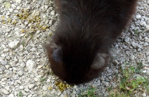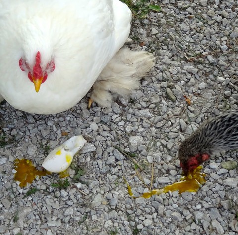 Daisy laid a soft shelled egg during afternoon yard time. The chickens scarfed it up, and even Sly took a taste.