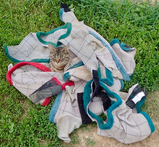 Finn is keeping warm by snuggling in our fly masks. 😺