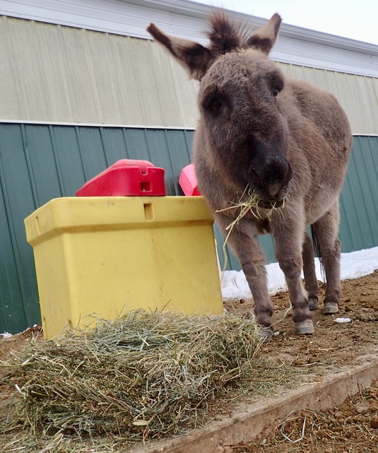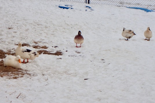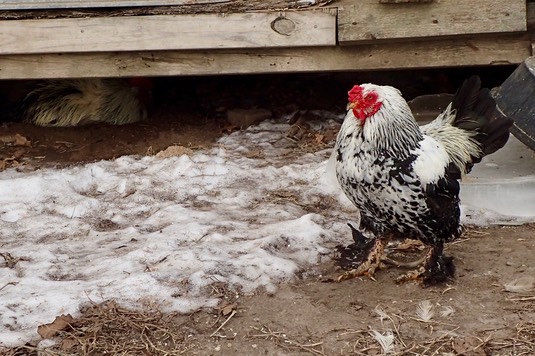 Baldy is way over by the hay barn this morning. He’s trying to talk to Hansel, who, if you look hard, is having a dust bath under the floor: