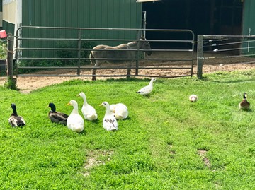 What are these ducks doing here? It’s not that they're not welcome, it’s just unusual to see them out of their pen. I think it’s because our friend Officer Mike was helping us trim the grass, and the mower noises scared them up here: