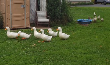 The neighbor's 6 pekins cross the street, uninvited, to avail themselves of our facilities: