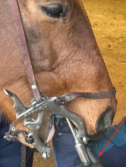 So the vet came out and discovered Jewel had a tooth that needed to be sanded down (the arrow points to Dr. Caroline’s hand as she works the machine):