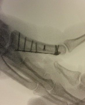Mary checks Stormy's leg in 2006. His baby brown has turned to gray!