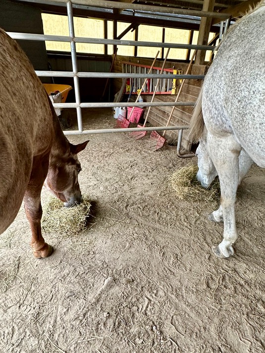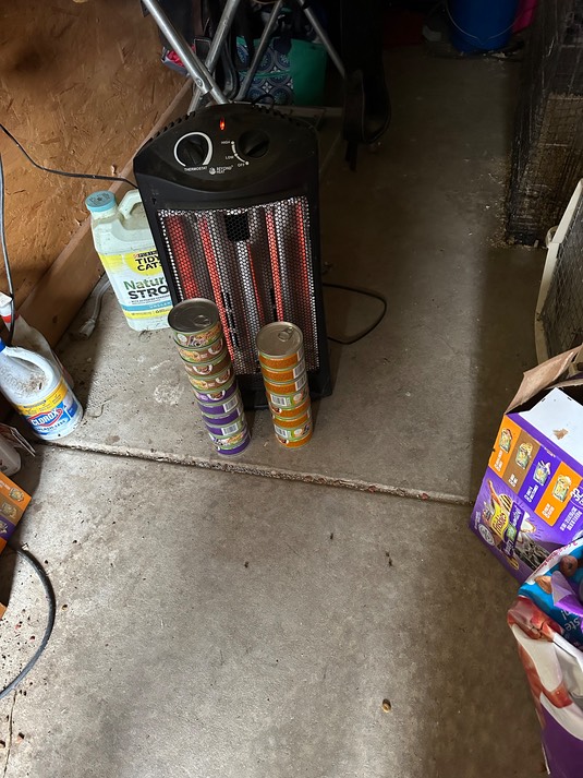 The tack room heater was set up last night, so this morning the cat food is hot, soft and juicy:
