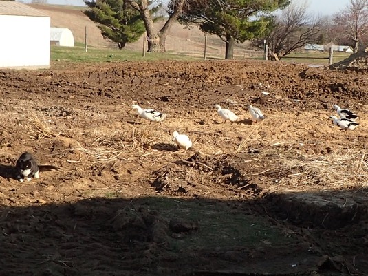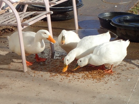 The chicken coop is still gone. The ducks look for bugs in the sand left in its place. 😺