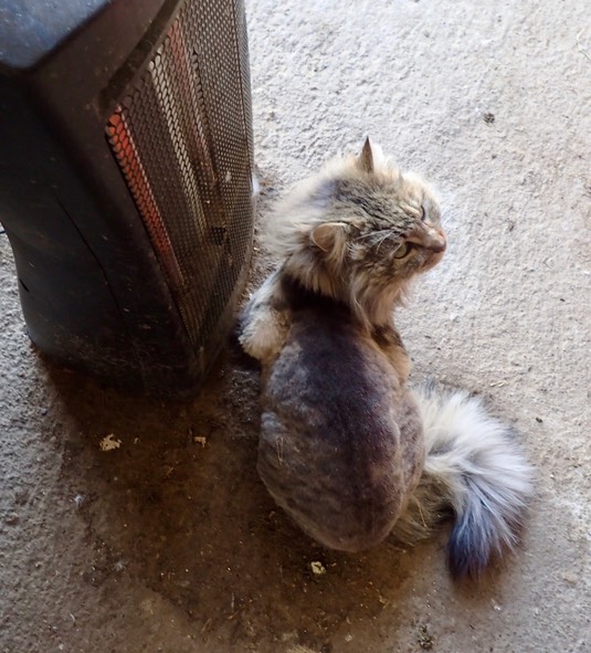 There’s ice on the water this morning, so Buttons hopped right in front of the space heater—right after breakfast!