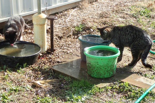 Here’s Schroeder and Onslow enjoying some just-drawn water. A pink tongue (on Schroeder) makes a healthy cat: