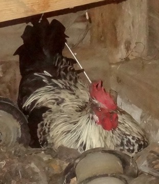 We showed you last Tuesday how Hansel and Franz were fighting. Well, the cat cops decided to separate them for the day by leaving Hansel outside. It turns out the older roosters (Mr. Peepers, Baldy and Mildred) chased Hansel around all day. In the evening he was found sheltering in the old chicken coop:
