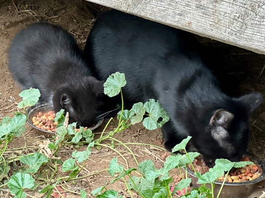 Finally, here are Gray-baby and Tabby wrestling. We think Tabby’s coloring is that of a “marble tabby.”