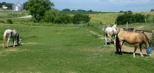 Stormy, Iris and Misty are out in the front pasture by themselves, while the rest of the horses share the far pasture with Jewel and Rose: