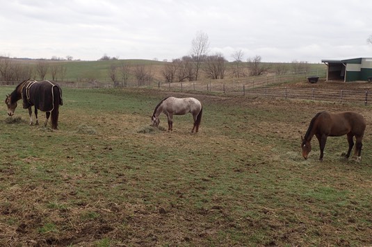 Yesterday morning, we were fed breakfast early, at about 6:30. Here we are coming in from the far pasture, where we were at the time: