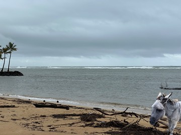 I spent last week in a very wet, windy Honolulu, with record rain, landslides, and power losses. Here I am on the beach, full of flotsam washed up by the storms:
