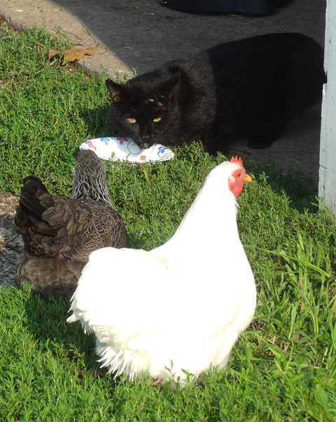 Evil Cat discovers that he too must tolerate the chickens at meal time (and that they must never be the meal):