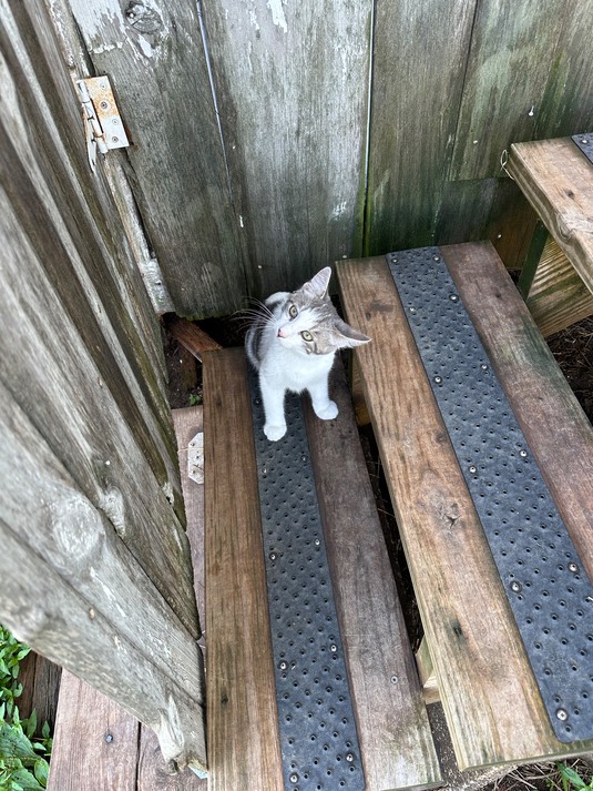 Don’t worry, I’ll instruct the cat-cops to escort her out. It’s going to be another scorcher, and little kitty Dot might not know how to get out on her own (the big cats know to jump up over the back wall):