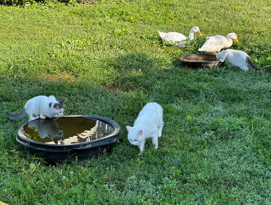 Dot and Betty are tasting some fresh water and Mini is “bobbing for mealworms.” 😹