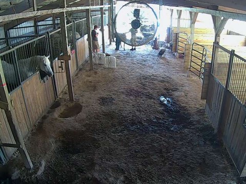 Judging from the hooves behind the ceiling fan, I’m getting worked on, which means we're almost done. You can see Bill checking his phone. He’s near the floor fans we use to help keep Travis and his customers cooler.