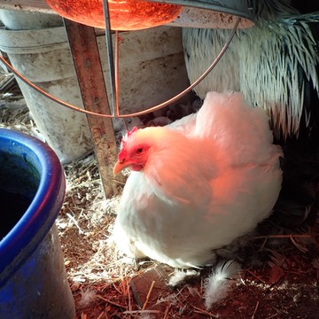Dot stays cozy under the heat lamp:It also sets her off in a nice rosy glow! 🐔