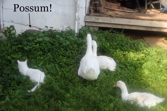 But—oh no!—an opossum (or possum, the “informal” term) walks right by the ducks, and Betty, like it owns the place: