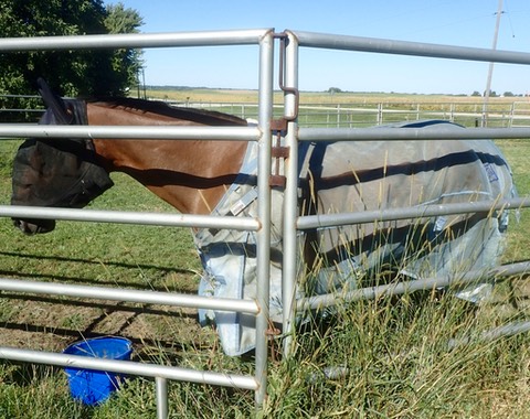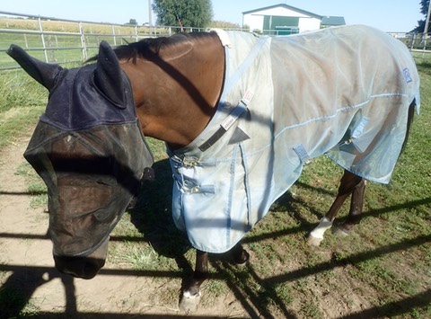Here’s Jewel in the riding circle. She’s dressed in her fly mask and fly coat.