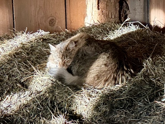 She sleeps way up by the ceiling, away from chickens, ducks, other kitties, horses, and cat-cops!