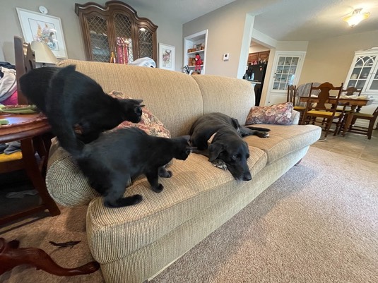 And here are the curious kitties, meeting Dukie! This is the first time they’ve seen a doggie: