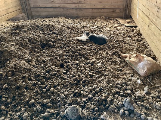 Anyway, Juno is stretching out on the manure pile in the stable: