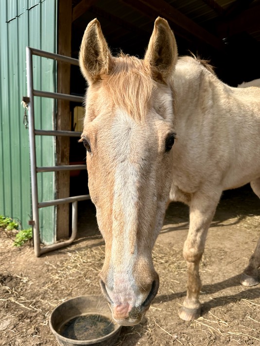 “As of last night we’ve each been put on a specific diet. Only my diet stays the same: 2 heaping scoops of sweet, high-calorie senior feed. But from now on, Stormy gets 2 cups each of Safechoice and hay pellets, and 1 cup diet balancer; Rose gets 2.5 cups of balancer and 2-3 cups of pellets; and Francis gets only 1 cup of balancer and 1 cup of pellets—poor Francis!”