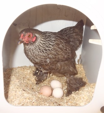 Two of the eggs are not real (“china eggs" put hens in the mood to nest). But the egg closest to her left leg is all her own.