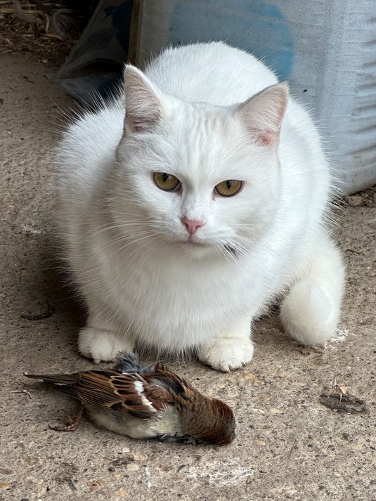 Betty caught a sparrow (don’t worry, Mr. Sparrow is playing possum, and is about to fly away):