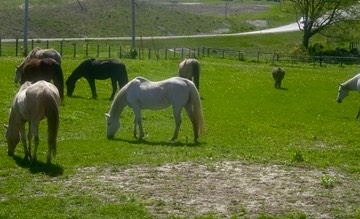 Here we are in the front pasture on a lovely sunny day. We can’t eat too much, because we think that’s how Charlie got sick the last time.