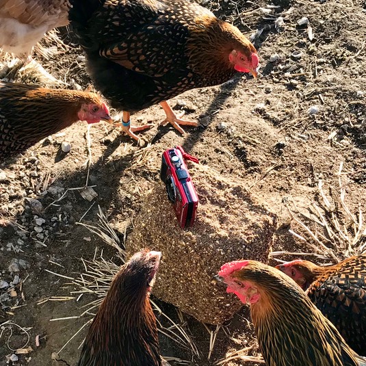 The chickens also say, “Good morning. Someone left their camera on our seed block.”