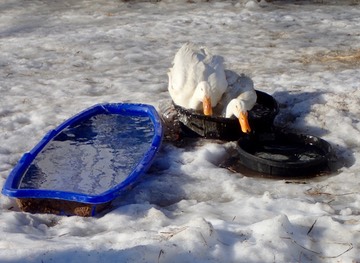 The water didn’t freeze overnight, so Ferdinand and Percy had 3 bathtubs waiting. So, of course, they crowded into one, instead of spreading out: