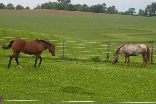 Mary used the big tractor to mow the front pasture. It uncovered a lot of blossoming clover for Jewel and Rose: