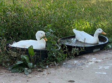 Ferdinand and Paschal say, “Good morning! It’s chilly and windy, but that doesn’t stop us from taking our bath. Aren’t we lucky to each have our own tub!”