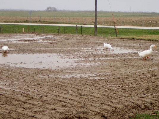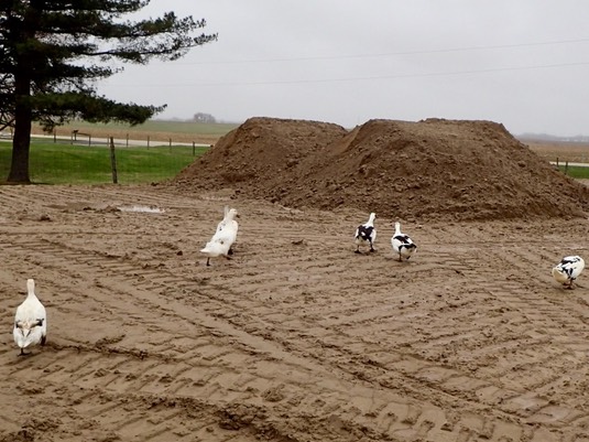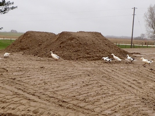 The ducks investigate the “pyramids” left by the trucks and bulldozers yesterday: