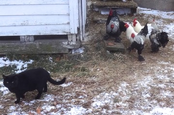 The roosters move in on Evil Cat’s Thanksgiving dinner 😿: