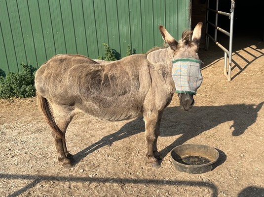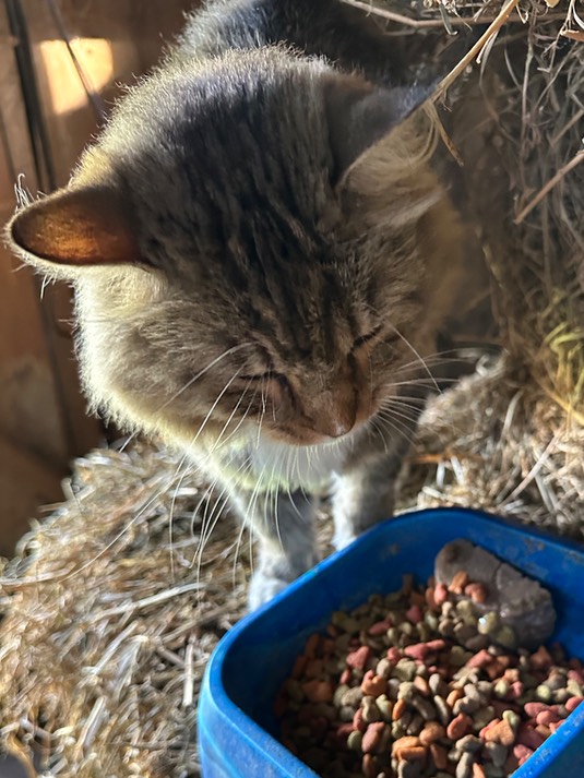 Thanks for greeting our friends, Buttons. I’m not a carnivore, but I’m sure that’s a great cat breakfast. It’s going to be in the 90’s today, so I’m glad we have just-washed masks, also the fan to going in the stable: