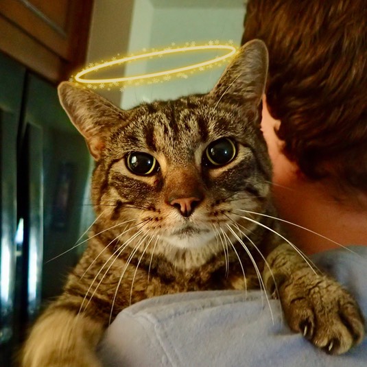 Our dear Finn went to kitty heaven yesterday. She was very sick for a long time. Here she is being cuddled by her favorite person, Bill: