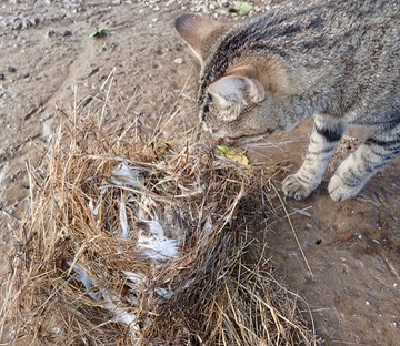 Noodle checks out a sparrow’s nest blown down by the storm: