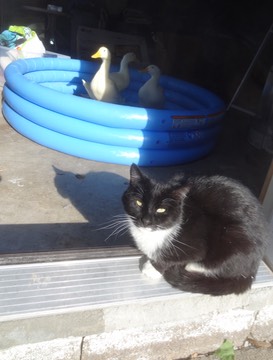 Since the ducklings are now big enough to easily hop in and out of the pool, Schroeder is employed to keep them contained while their outside pen gets food and water: