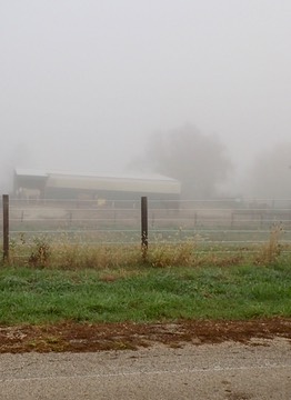 Foggy Friday.We can barely be seen.Here are the ducks, and one rooster, in the front pasture.