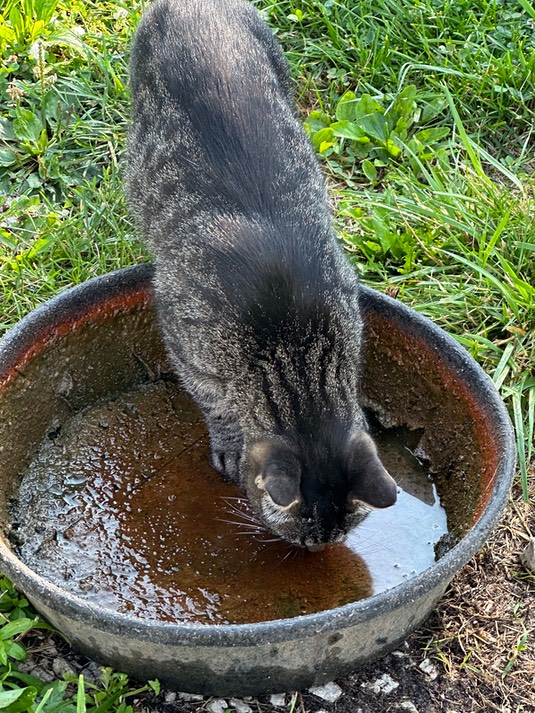 Speaking of having a drink, Onslow is drinking from an almost-empty pan of old duck water: