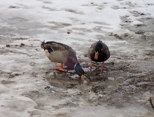 It’s in the mid-forties today, but it’s expected to be in single digits overnight. So the ducks are making the most of it, having found some water to putter around in: